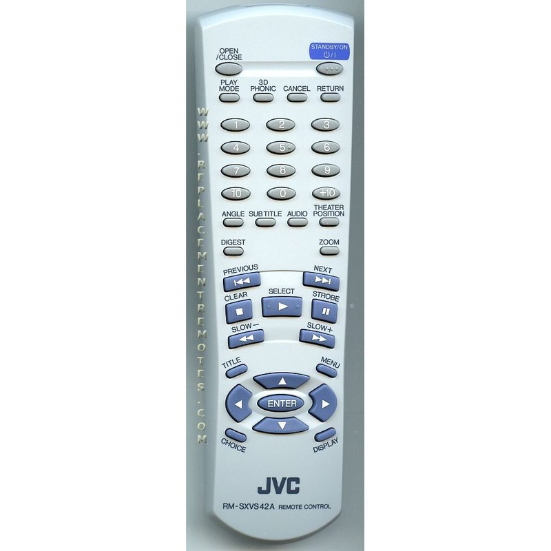 Model: RM-SXV597150A2AJVC DVD PLAYER REMOTE CONTROLRegistered on 2000-12-01 Originally supplied with models: XVE100SL, XVLTR1, XVS40BK, XVS42SL, XVS45, XVS45GD